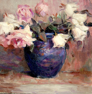 When he painted this piece Renoir was at the stage of dissolved outlines, so this may look pretty fuzzy to you, but it holds a lot of appeal for me. I am pretty sure he must have used a round brush as it was the only way I could capture some of those nuances of light and shadow. His color was beautifully luminous and his brushwork, skillfully varied. Renoir painted quite a few roses but this one attracted me as it is different from the previous techniques I have copied.